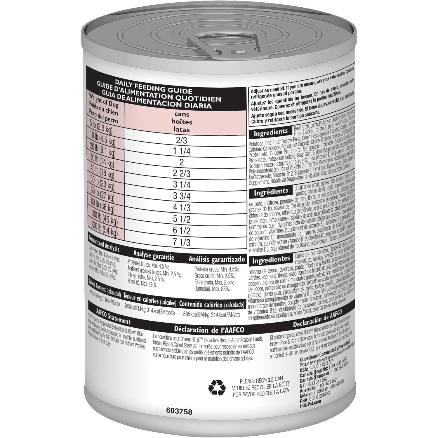 Hill's® Bioactive Recipe™ Adult Braised Lamb, Brown Rice & Carrot Stew dog food is formulated to meet the nutritional levels established by the AAFCO Dog Food Nutrient Profiles for maintenance of adult dogs.